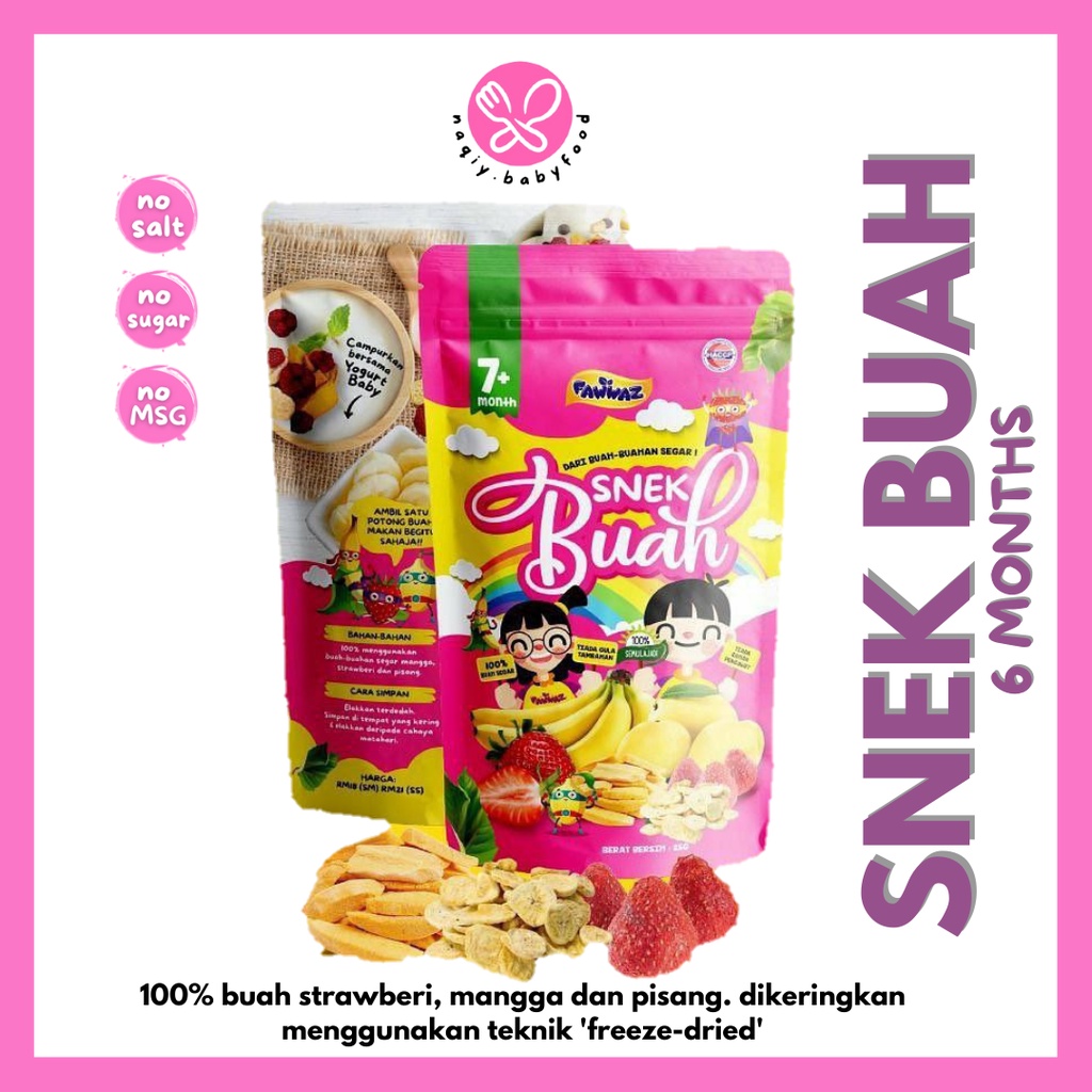 FAWWAZ Baby Cookies RM 2500. Haaa mesti ramai kan. Snek Buah RM 1800 Fawwaz Baby Food Terdiri daripada 3 buah pisang strawberi mangga Sesuai daripada 6 bulan Rangup dan cair dalam air liur 100 bahan asli tanpa pengawet dan gula sesuai dijadikan FINGER FOOD Dihasilkan menggunakan kaedah freeze dried Tanpa pengawet TANPA GARAM TANPA GULA TANPA PERASA TAMBAHAN TANPA PEWARNA TANPA PENGAWET.